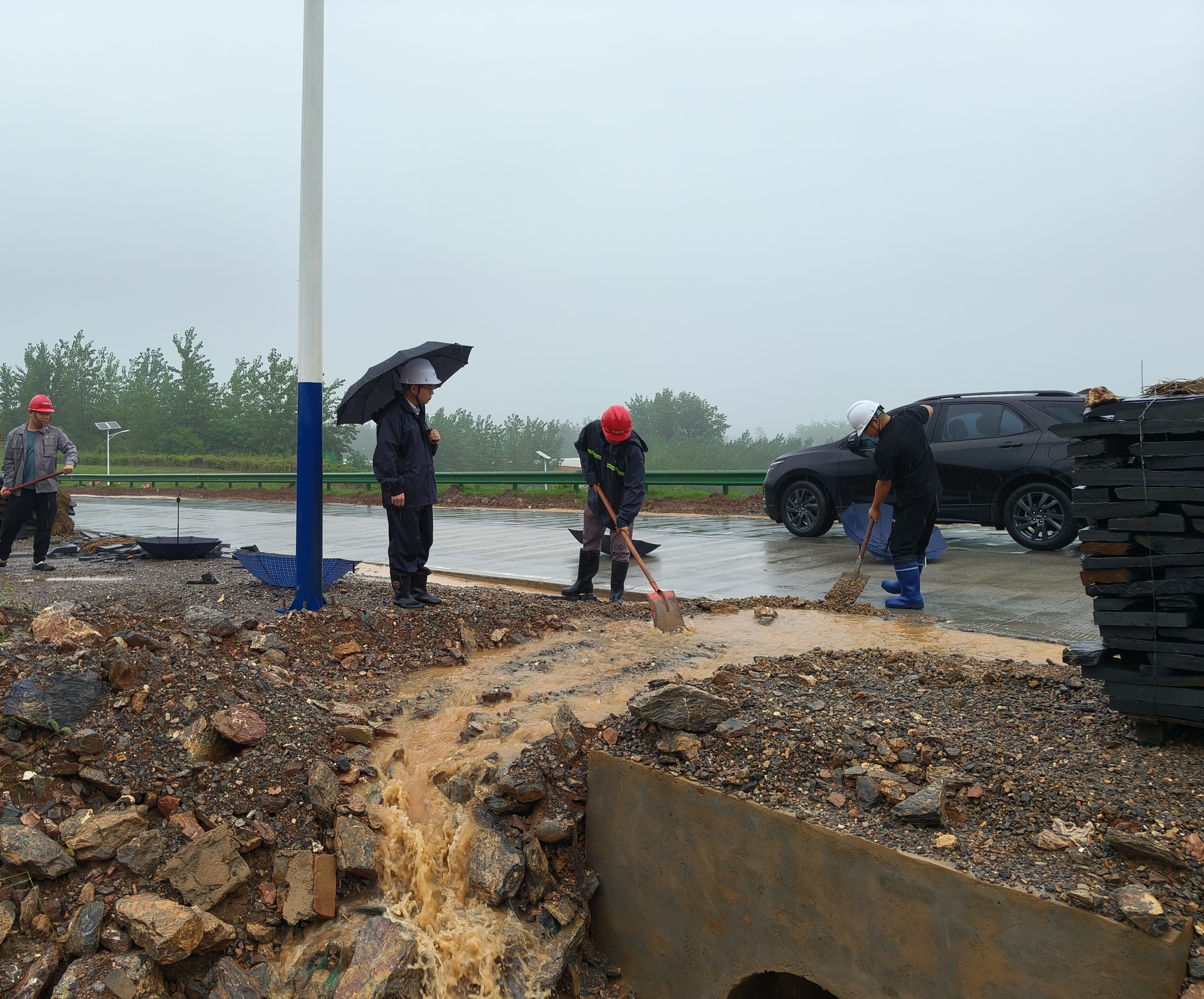 搶險現(xiàn)場,黨員干部帶頭,通過沙包筑堤、開挖排水溝等措施進行預防,同時對礦區(qū)、加工區(qū)開展全面隱患排查。中午,水塘漫堤隱患消除。