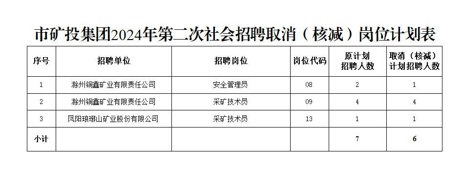 根據(jù)《滁州市興滁礦業(yè)投資集團有限公司2024年第二次社會招聘公告》規(guī)定,經(jīng)對各崗位報名情況篩查審定,結(jié)合資格復審情況,部分崗位報名情況未達到開考比例,經(jīng)研究決定取消(核減)以下崗位招聘計劃: