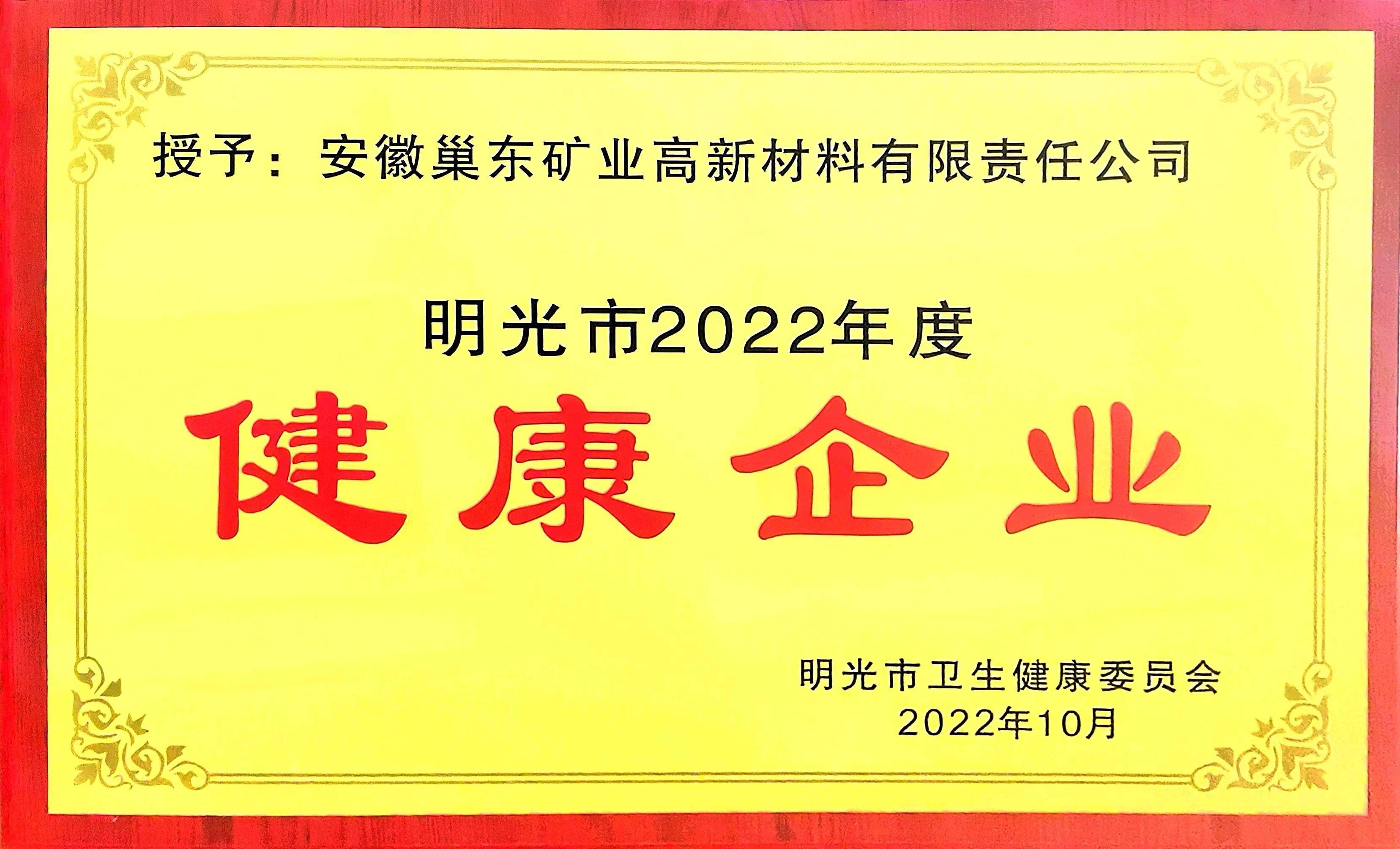 3月17日,2022年明光市健康企業(yè)表彰儀式在明光市舉行,滁州市興明礦業(yè)有限公司下屬全資子公司安徽巢東礦業(yè)高新材料有限責(zé)任公司榮獲“2022年度明光市健康企業(yè)”榮譽(yù)稱號(hào)。
