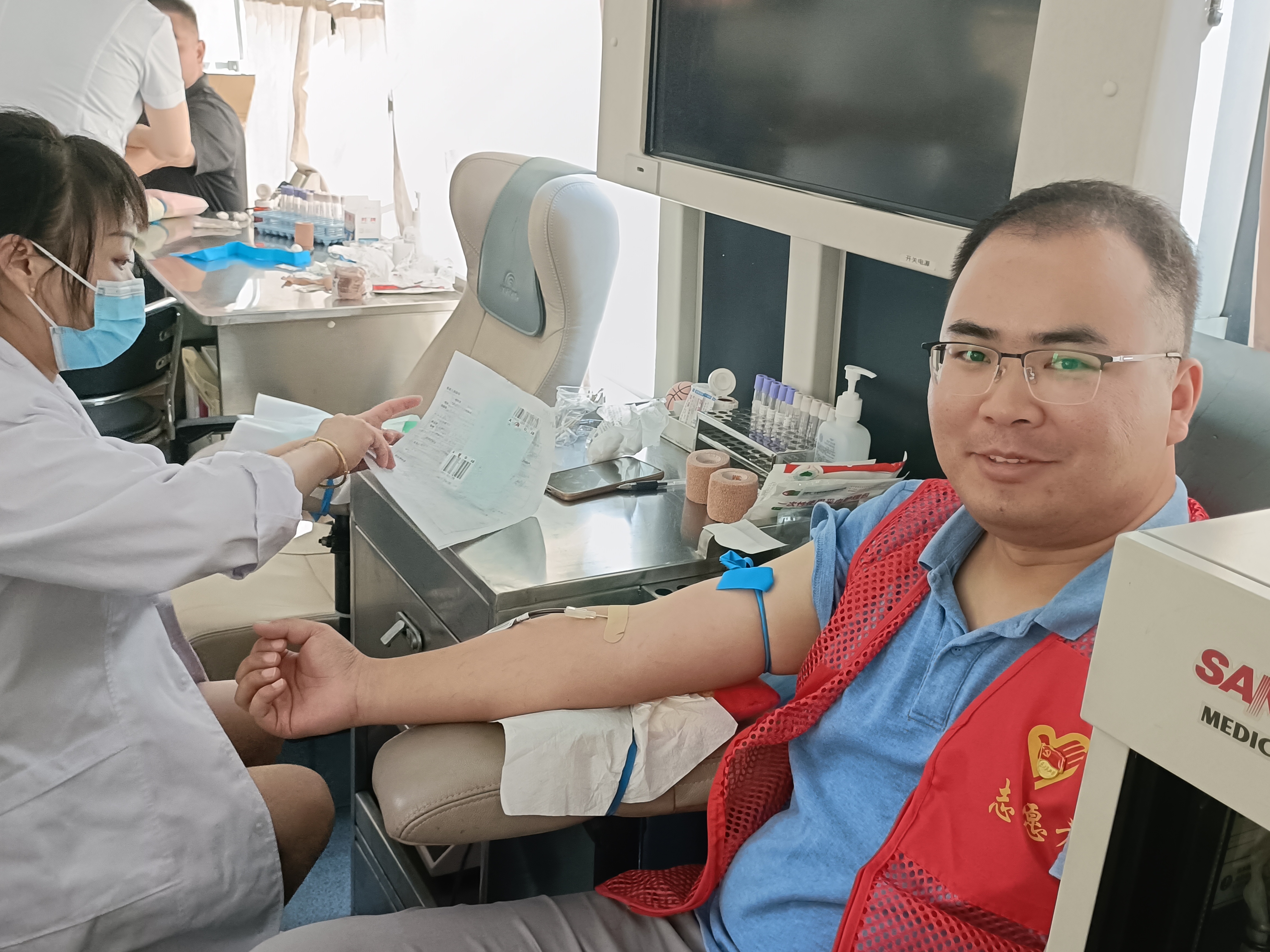 興天礦業(yè)黨支部黨員發(fā)揮帶頭作用,在工作人員的指導(dǎo)下,多名黨員志愿者在現(xiàn)場(chǎng)按次序進(jìn)行登記、血壓測(cè)量、血液測(cè)試、采血等,據(jù)悉,部分黨員已是多次參加獻(xiàn)血。