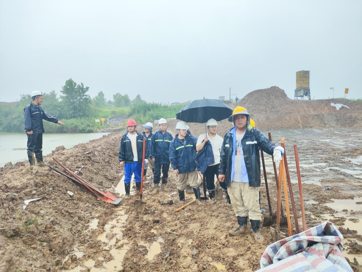 連日強降雨導(dǎo)致諭興礦界外河流水位暴漲,隨時可能漫進礦坑,并淹沒兩側(cè)農(nóng)田。興天礦業(yè)立即啟動應(yīng)急預(yù)案,動員公司全體黨員干部職工、工程公司及實業(yè)公司項目部工作人員、運輸隊司機等約30余名人員組成搶險突擊隊,調(diào)集挖機、渣土車用土石方對上游決口位置進行封堵。與此同時,突擊隊員肩扛沙袋、雨布等物資奔赴現(xiàn)場,爭分奪秒展開搶險工作。